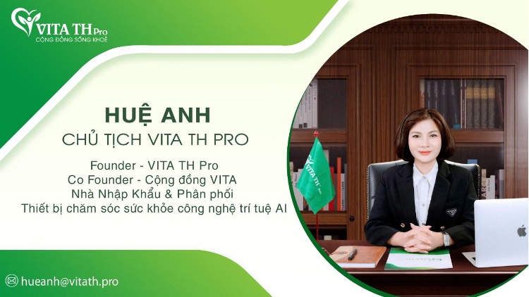 LỜI CHÀO Thân gửi Quý khách hàng và thành viên trong cộng đồng VITA TH PRO Tôi là Huệ Anh, người sáng lập VITA TH PRO, nơi tôi gửi gắm tâm huyết để tạo nên một hệ sinh thái chăm sóc sức khỏe chủ động, kết nối giữa công nghệ và con người. Với tôi, sức khỏe là nền tảng của hạnh phúc, và mỗi người xứng đáng được tận hưởng một cơ thể khỏe mạnh, tinh thần an yên. Từ trăn trở đó, VITA TH PRO ra đời, ứng dụng công nghệ AI tiên tiến, giúp thải độc – phục hồi – tái tạo năng lượng, mang lại sự cân bằng và trẻ hóa tự nhiên từ bên trong.